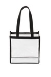 This see-through tote meets the policies for stadiums, concerts and events that allow clear bags. Clear PVC Polyester webbing handles and trim Dimensions: 11.75'h x 11.75'w x 5.75'd; Approx. 794 cubic inches Note: Bags not intended for use by children 12 and under.